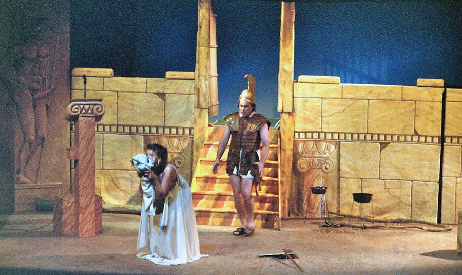 Eerste voorstelling door Piccolo Theater Dario Fo 26 januari 1997 in de bovenzaal van de Amsterdamse Schouwburg. Het eerste decor van Herman van Elteren (ontworpen voor Youp van ’t Hek) mocht Piccolo Theater Dario Fo gebruiken. Het bleek helaas te zwaar en te bewerkelijk voor de vele reisvoorstellingen. Ronald Vogel ontwierp een nieuw decor dat de voorstelling vleugels gaf.